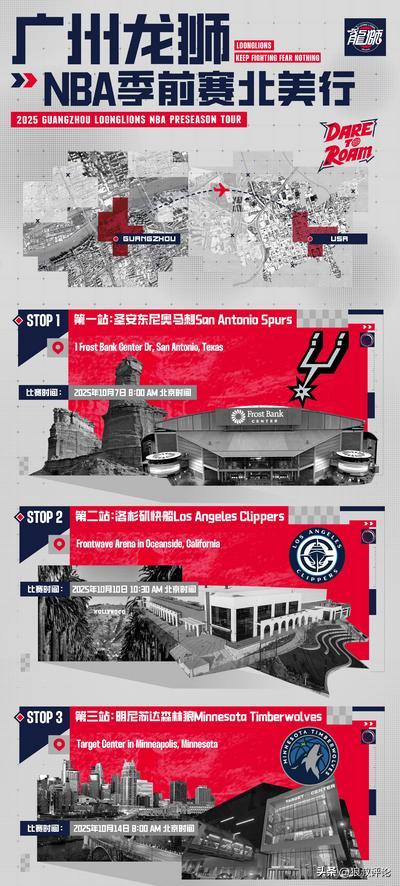 广州龙狮将在美国与续约的主教练米切尔直接会合,同时考察多名试训外援。他们这次季前赛之旅含金量十足,将先后对阵马刺、快船和森林狼这样的NBA季后赛球队,并找来加拿大国家队的康复团队进行保障。更重要的是,球队专门邀请多家NBA俱乐部球探去现场,考察徐昕等具备一定天赋的年轻球员。