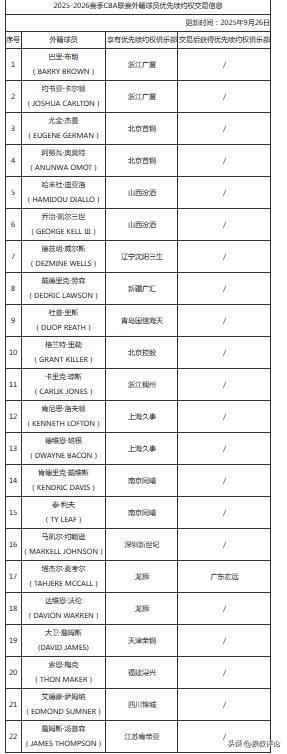 北京时间9月26日,根据CBA官方更新的外援续约名单,除了外界关注的布朗,约克,威尔斯等人之外,萨姆纳的签约权仍在四川男篮,而利夫,迪亚洛,凯尔,梅克等外援已经离开了CBA联赛,大部分的俱