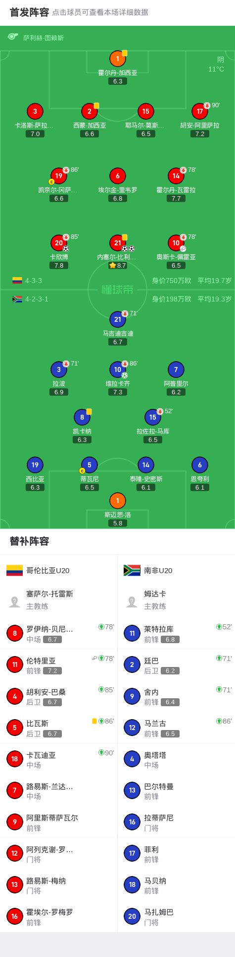 哥伦比亚U20 3-1南非U20,内塞尔-比利亚雷亚尔两球,卡欣博破门