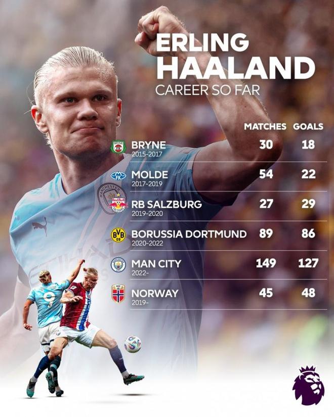 英超官方晒哈兰德进球分布:曼城149场127球,挪威队45场48球