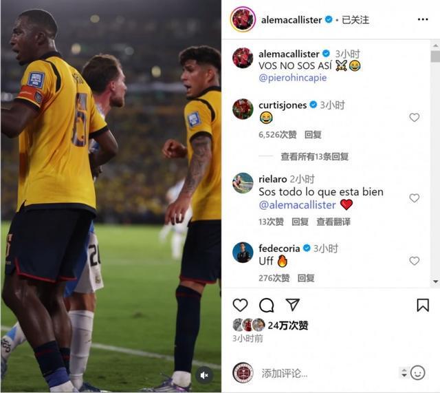 本场比赛伤停补时阶段,厄瓜多尔后卫因卡皮耶禁区内破坏马斯坦托诺的机会,并挑衅这位小将,麦卡利斯特冲上来与因卡皮耶发生冲突,两人对峙并争吵。