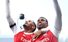 雷速体育9月29日讯 英超第6轮,阿森纳客场2-1逆转击败纽卡斯尔联。赛后,阿森纳前锋萨卡晒出与队友加布里埃尔的合照,庆祝这场比赛的胜利。