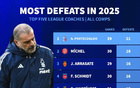 2025年五大联赛输球场次最多主帅:澳波第一,阿莫林第十